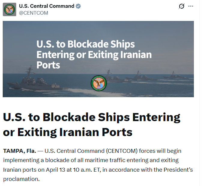 Theo báo cáo từ CENTCOM quyết định phong tỏa được đưa ra ngay sau khi các cuộc đàm phán ngoại giao tại Islamabad (Pakistan) đổ vỡ hoàn toàn. Quân đội Mỹ đã thiết lập các hàng rào phong tỏa nghiêm ngặt tại các cảng chiến lược của Iran, khiến ít nhất hai tàu chở dầu khổng lồ phải quay đầu ngay lập tức.
